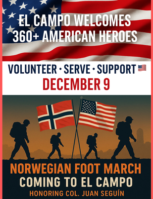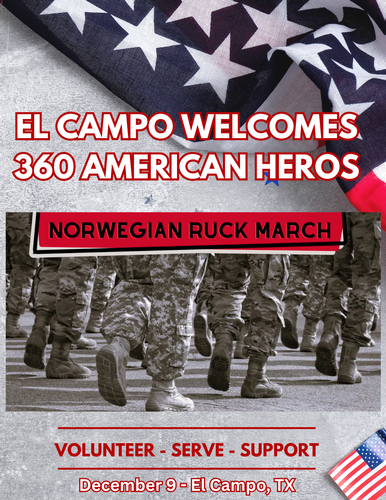 On Monday, December 9, El Campo will proudly welcome over 360 enlisted heroes from across Texas as they participate in the Norwegian Foot March — a challenging endurance event that celebrates discipline, strength, and service to our nation.