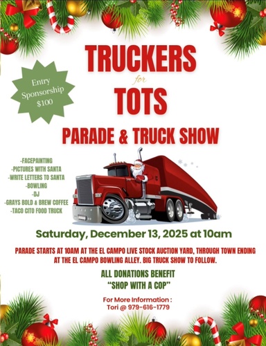 #TruckersForTots #ShopWithACop #ElCampoTexas #ElCampoChamber #CommunityStrong #HolidayFun #SupportLocal #FamilyEvent #ChristmasInElCampo #TisTheSeason #TexasTruckParade #ElCampoEvents #DoGoodFeelGood